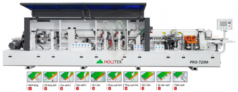 Functions (10-in-1) Double trimming unit for panel edges before banding Automatic feeding, gluing, edge banding, trimming excess tape Automatic end trimming (front & back ends) Rough trimming on top & bottom edges (1st pass) Fine trimming on top & bottom edges (2nd pass) Corner rounding on both ends of the panel Radius scraping for smooth edge finishing Flat scraping for fine surface finishing Cleaning fluid spraying to remove glue residues Buffing & polishing unit for perfect edge finish