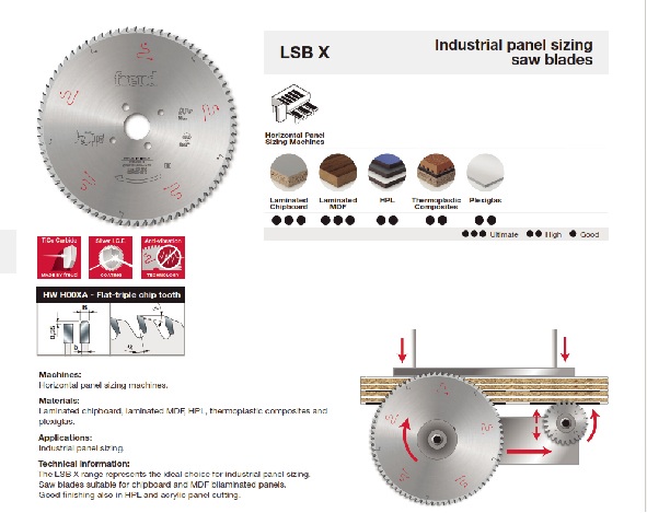 Machines: Horizontal panel sizing machines. Materials: Laminated chipboard, laminated MDF, HPL, thermoplastic composites and plexiglas. Applications: Industrial panel sizing. Technical information: The LSB X range represents the ideal choice for industrial panel sizing. Saw blades suitable for chipboard and MDF bilaminated panels. Good finishing also in HPL and acrylic panel cutting.